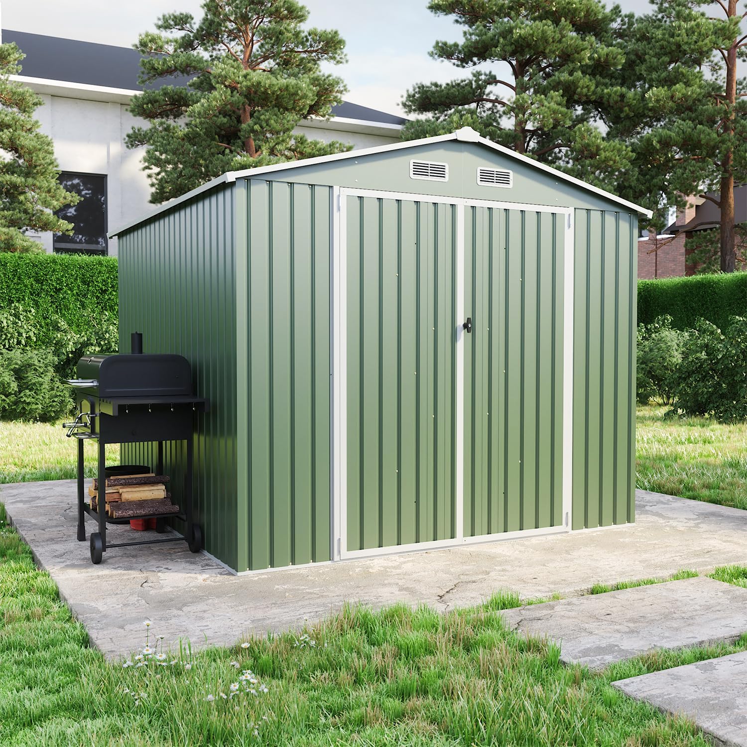 Casetta da Giardino in Acciaio Zincato 2,56x2,56x2,16 m, 6,55 m², con Tetto Spiovente e Porta Battente, Verde