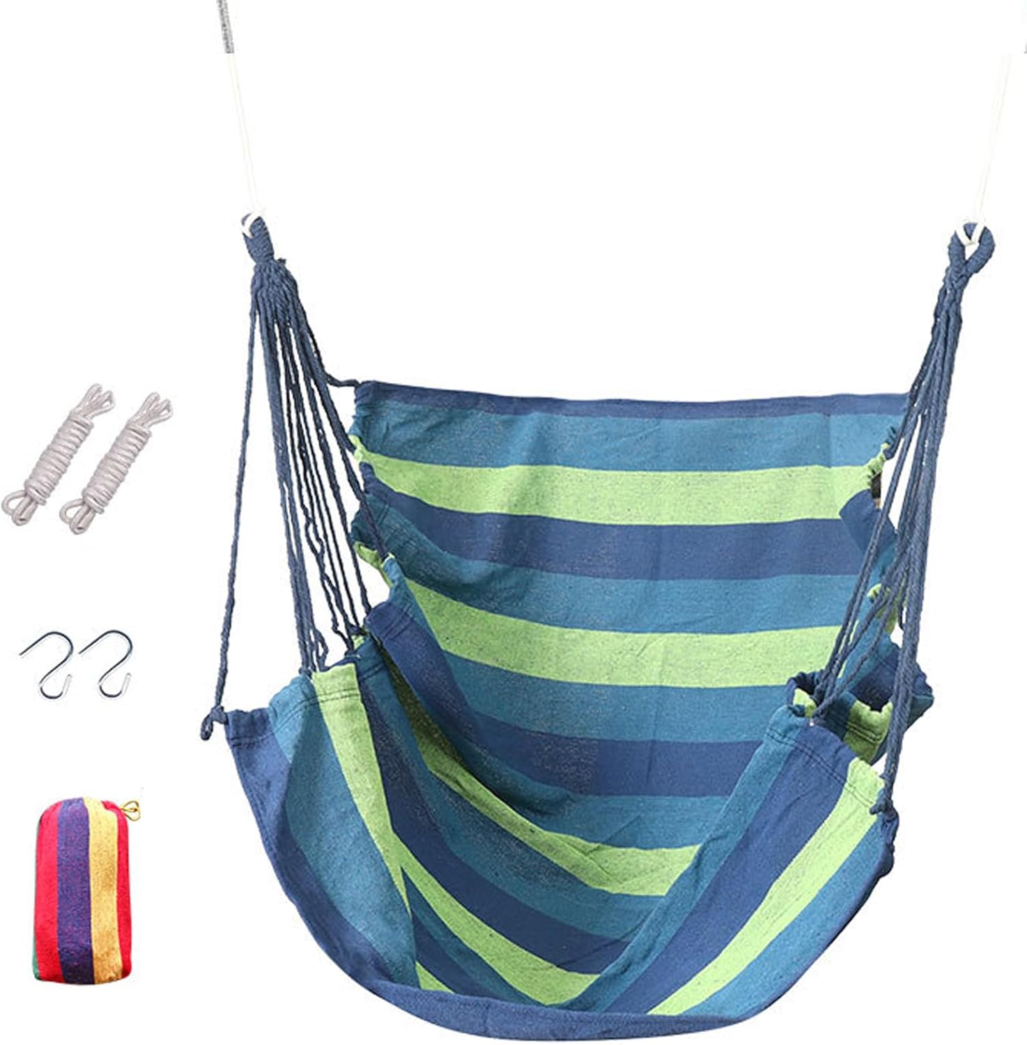 Sedia Sospesa Regolabile a Righe Blu Verdi per Interni ed Esterni in Corda con Sgabello